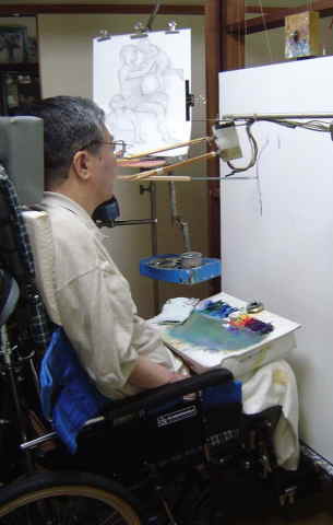 | 私は、手が使えませんので、口に筆をくわえて描いておりま す。直接筆をくわえると、筆の塗料がはげて口に入ったり、 くわえている場所がボロボロになってしまいます。それと、筆 を直接くわえたのでは、あまりにもキャンバスに近すぎて絵の 全体像がつかみずらくなります。そこで、約1cm角の角材を 30cmほど継ぎ足して筆を長くして使用しています。 パレットは、膝の上に置いて、必要な絵の具を出しておいて もらえば、後は自分でできます。 描くときには、歯医者で作ってもらったマウスピースをします。 使う筆は、やわらかい毛先の平筆が使いやすく、10号以下 のサイズのものを使っています。それ以上の太さになると重 たくて、絵の具も乗せにくく、歯にこたえて使えません。 困るのは、使える技法(テクニック)が限られているので、 表現に苦労していることです。キャンバスに対してほぼ直角 にしか絵の具をのせられませんので、必然的にうす塗りに なります。 赤堀通夫 |